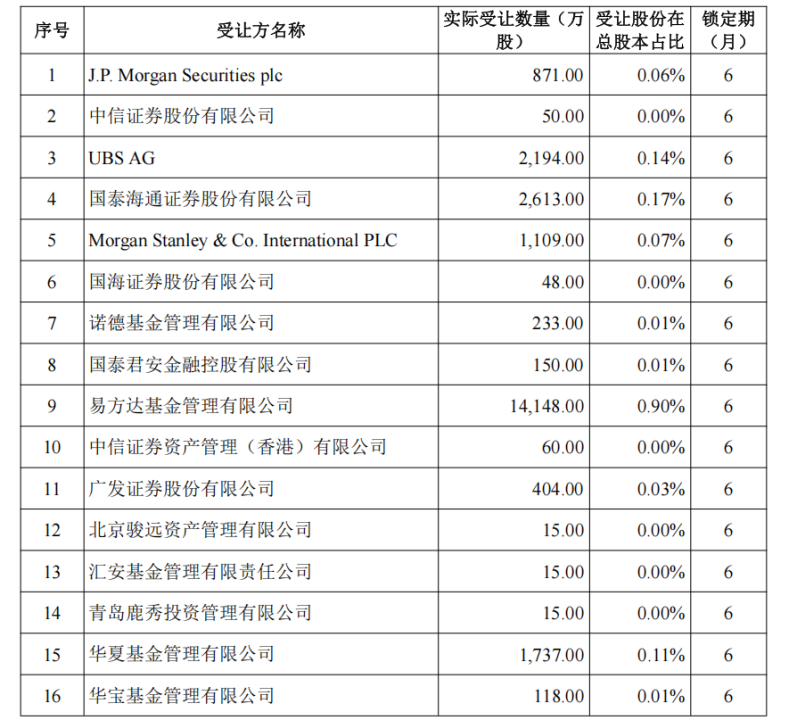 从获配股份规模来看,易方达基金管理有限公司获配14148万股,是此次询价转让中受让股份最多的一方,按照24.40元/股计算,受让规模高达34.5亿元,可谓重仓买入,占到此次陆丽丽、沈友根转让股份的六成。此外国泰海通证券、瑞银、摩根士丹利、华夏基金等机构受让股份数量也超1000万股。